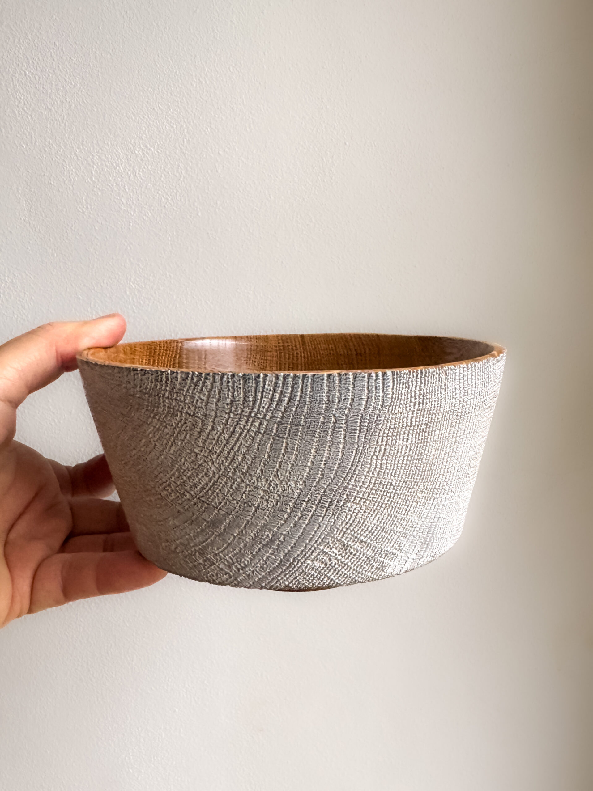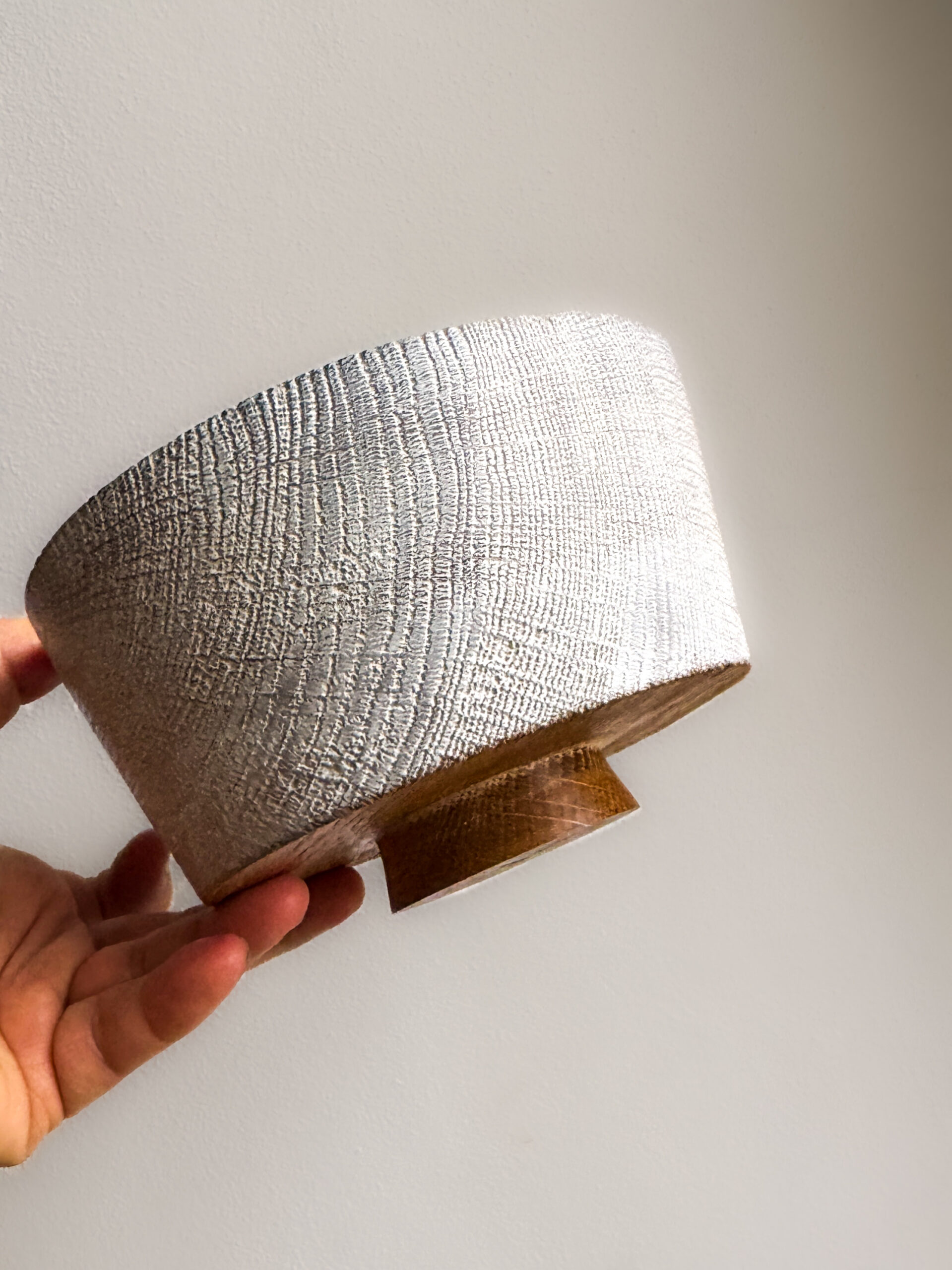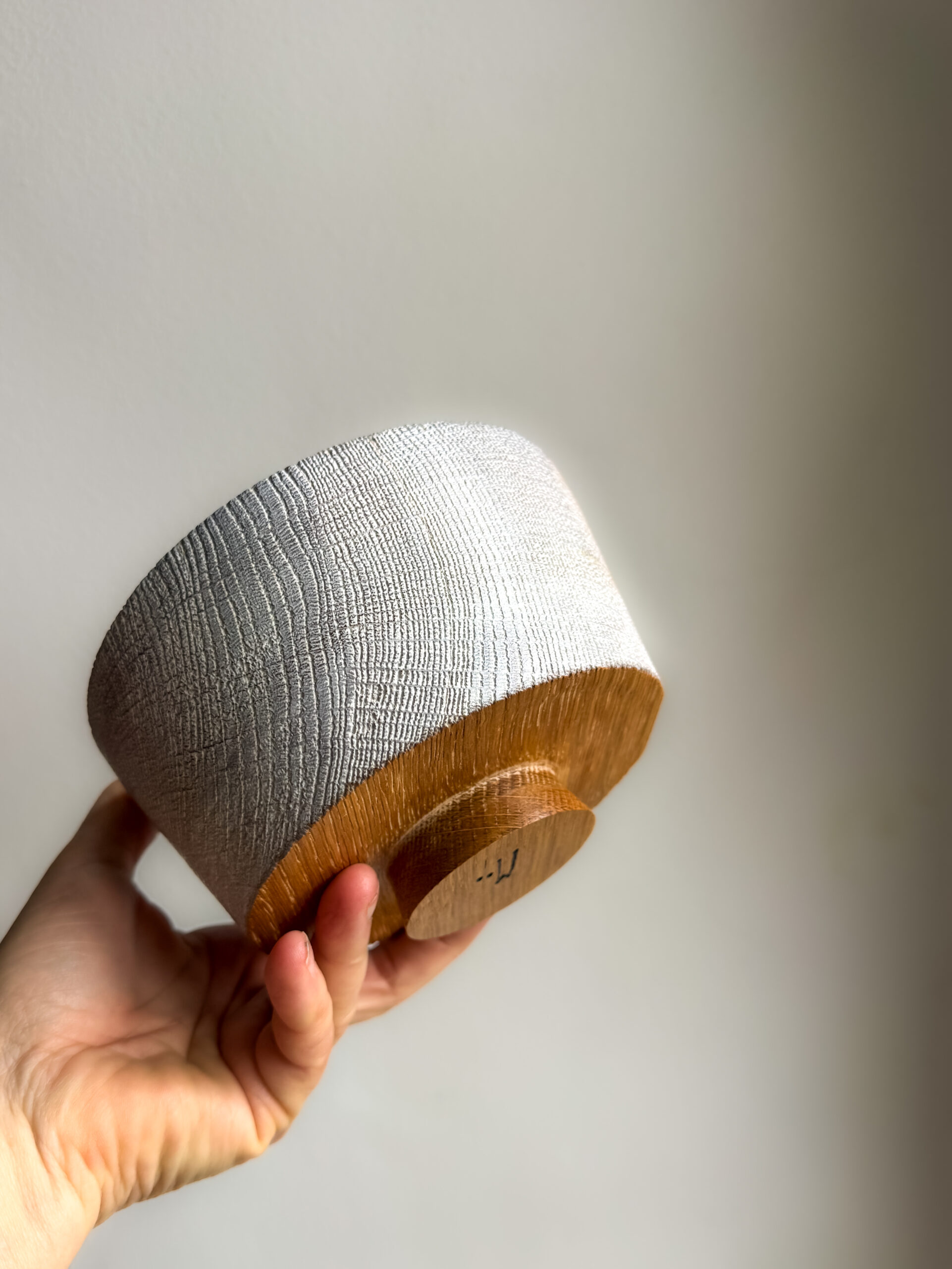 Sklede iz serije White Moon so izdelane iz suhega hrastovega lesa, natančno stružene, ročno krtačene in brušene, da se razkrije bogata struktura letnic. Površina je obdelana z belim voskom, ki poudari naravno risbo lesa in ustvari mehko, skoraj kredasto svetlobo na zunanjosti. Notranjost ostaja gladka in topla na otip.