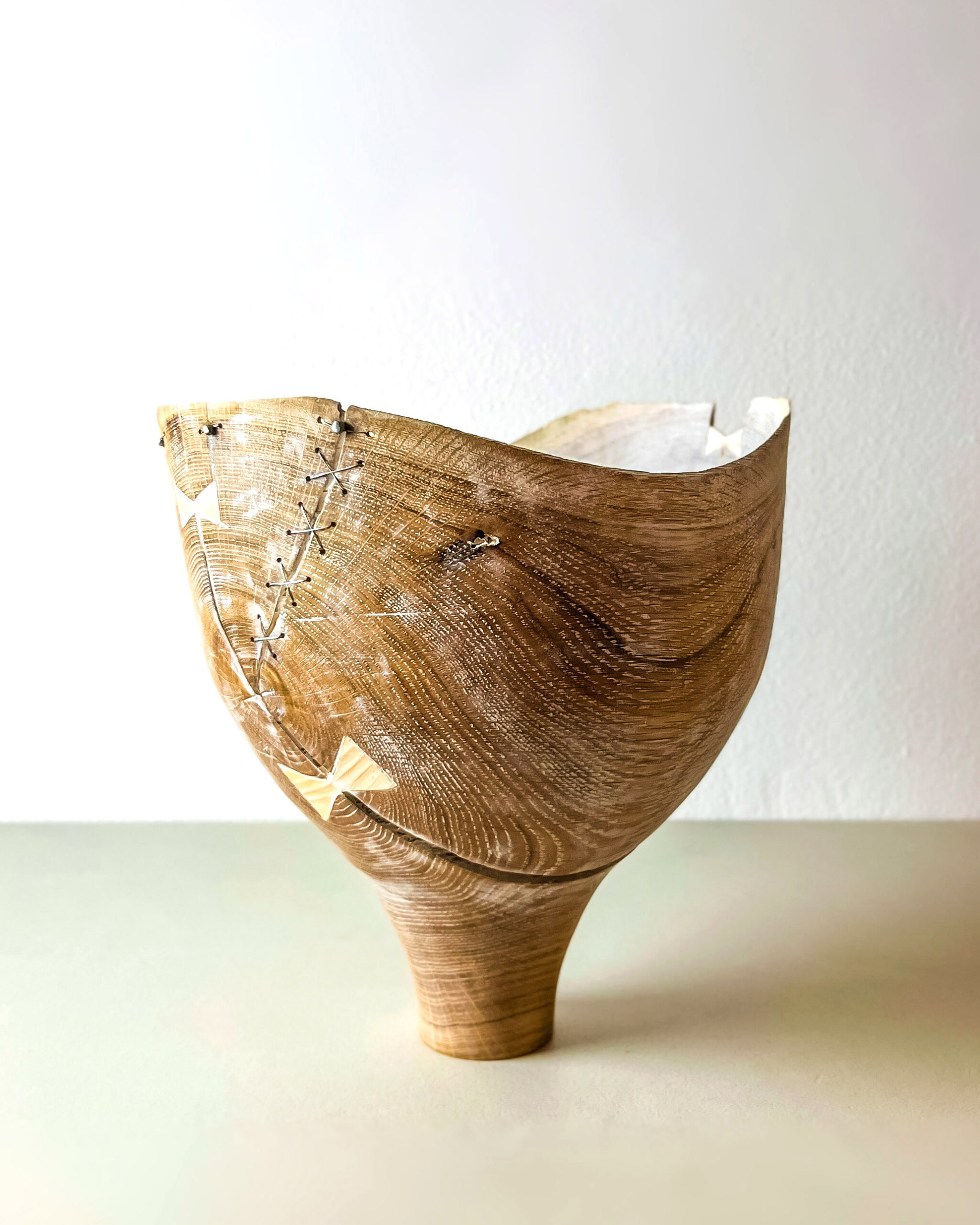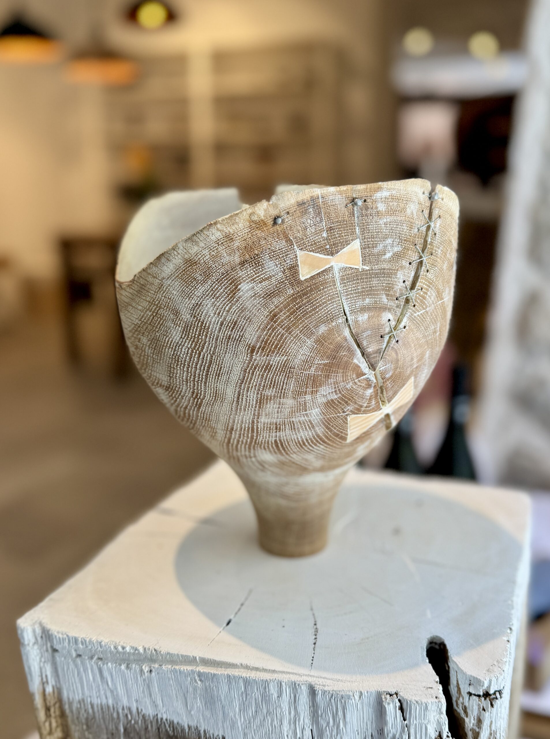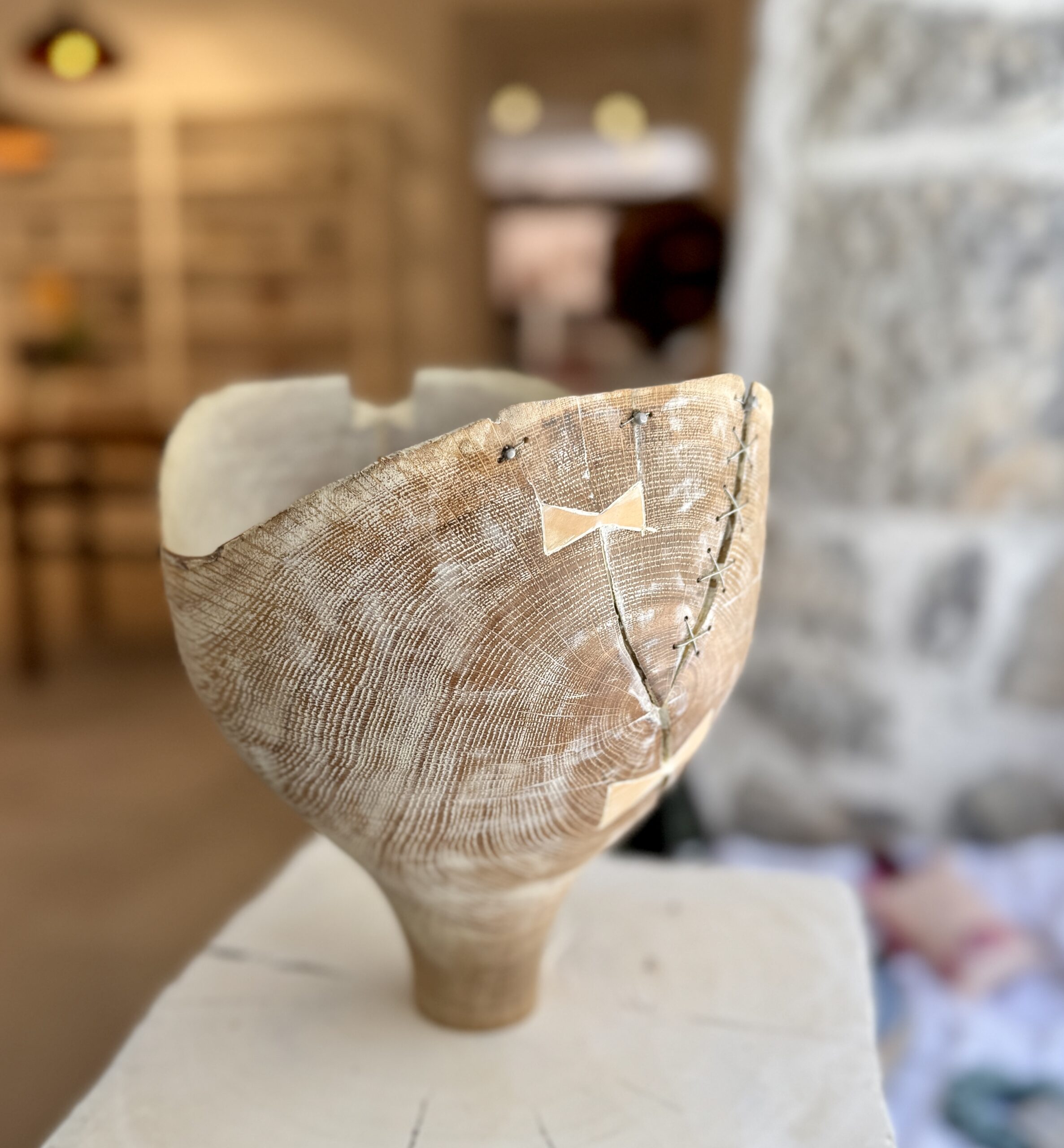 Krhke stvari so ročno izdelane lesene posode, ki raziskujejo poetični potencial razpokanega materiala. Razpoka, ki bi jo običajno skrili, je poudarjena z vidnimi šivi iz žice in tradicionalnimi lastovičjimi vezmi. Ta “popravljena rana” postane osrednji estetski in simbolni element. Vsaka skulptura je unikat, izdelana iz enega samega kosa lesa lokalnega izvora, pogosto iz opuščenih sadovnjakov ali podrtih dreves. Zasnova črpa navdih iz filozofije wabi-sabi, ki v ospredje postavlja minljivost, nepopolnost in dostojanstvo staranja. Kombinacija ročnega dela, premišljenega oblikovanja in zavestne uporabe napake ustvarja izdelek, ki je hkrati objekt kontemplacije in tihe odpornosti.