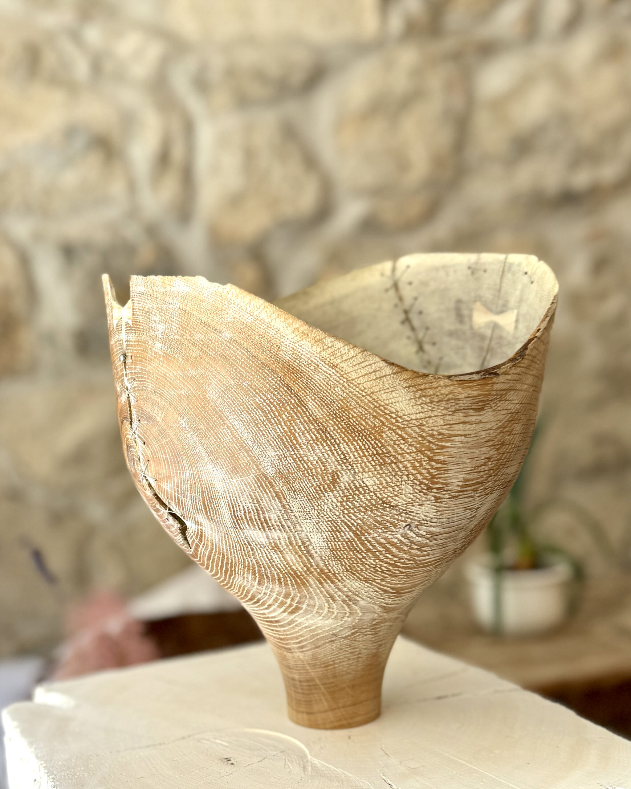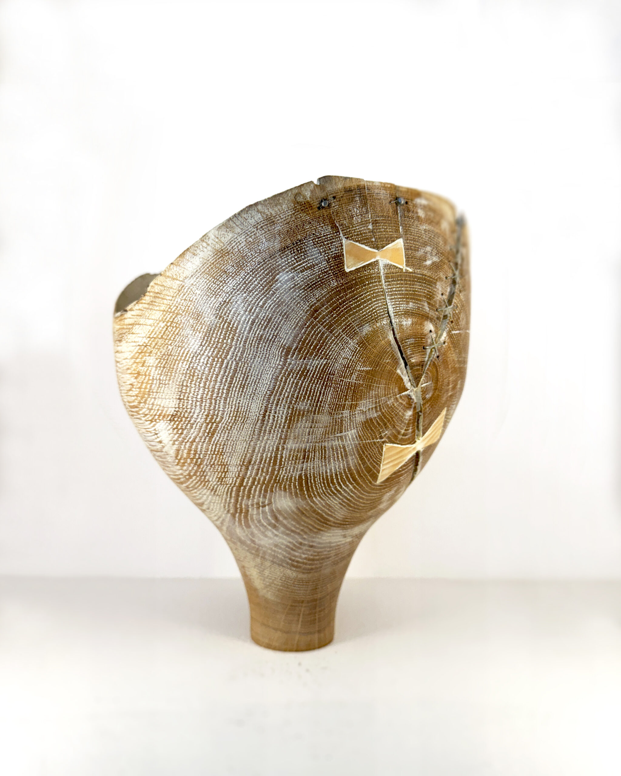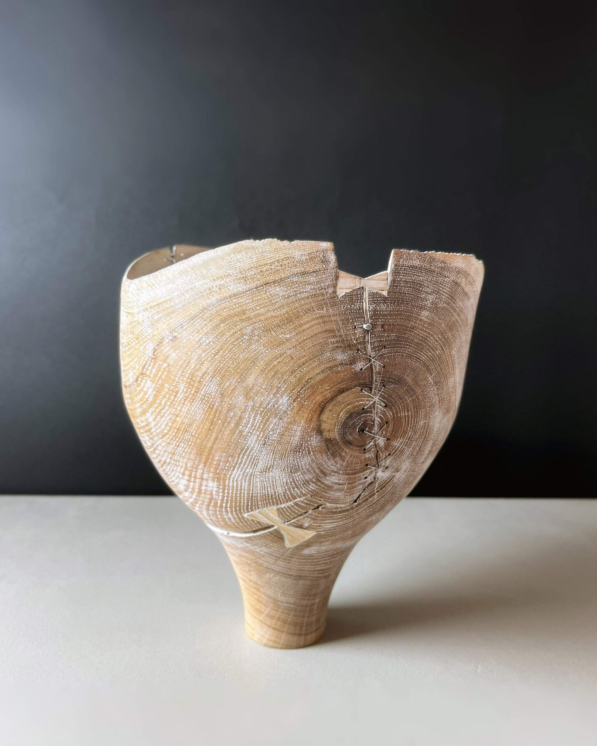 Krhke stvari so ročno izdelane lesene posode, ki raziskujejo poetični potencial razpokanega materiala. Razpoka, ki bi jo običajno skrili, je poudarjena z vidnimi šivi iz žice in tradicionalnimi lastovičjimi vezmi. Ta “popravljena rana” postane osrednji estetski in simbolni element. Vsaka skulptura je unikat, izdelana iz enega samega kosa lesa lokalnega izvora, pogosto iz opuščenih sadovnjakov ali podrtih dreves. Zasnova črpa navdih iz filozofije wabi-sabi, ki v ospredje postavlja minljivost, nepopolnost in dostojanstvo staranja. Kombinacija ročnega dela, premišljenega oblikovanja in zavestne uporabe napake ustvarja izdelek, ki je hkrati objekt kontemplacije in tihe odpornosti.